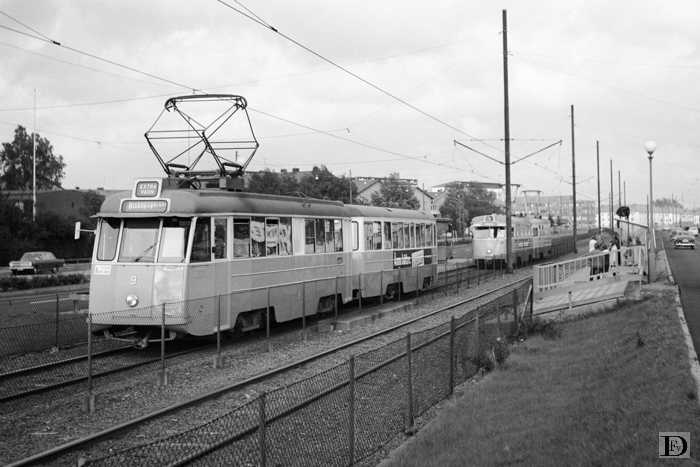Hjalmar Brantingsgatan bij Mötesplatsen met een "Extra Vagn" naar Biskopsgården en een lijn 5 naar Bräcke.