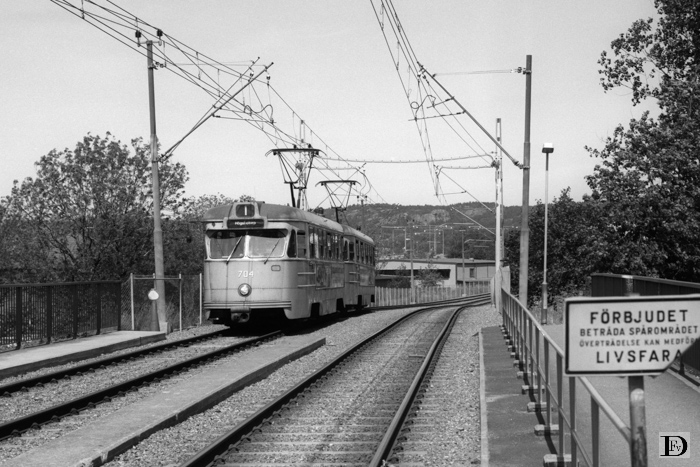 Tweewagentram op lijn 1 komt van Östra Sjukhuset en rijdt bij het oude eindpunt Vidkärr het nieuwe traject af.
