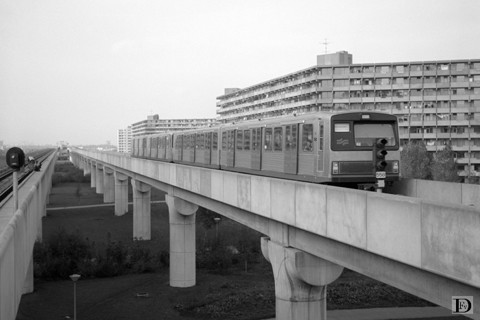Metrotrein richting Weesperplein rijdt station Kraaijennest uit. Op dit baanvak zijn twee enkelsporige viaducten gebouwd, die wat minder massief aandoen dan één dubbelsporig viaduct.