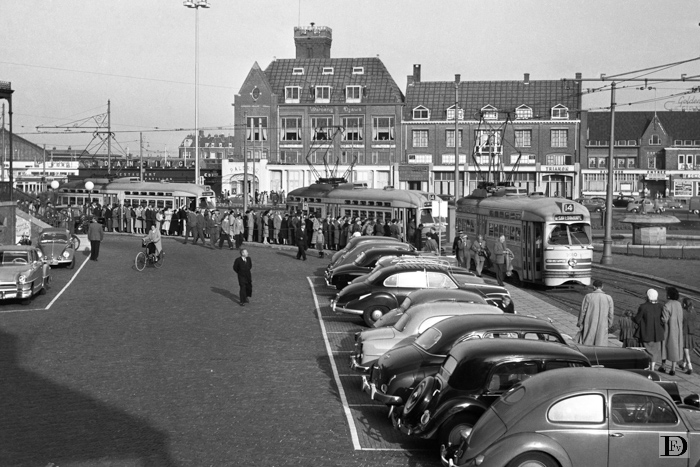 Drie PCC-cars zijn tegelijk aan het laden, teneinde het enorme vervoer van dagjesmensen, die op het strand en de Boulevard zijn geweest, vlot te verwerken.