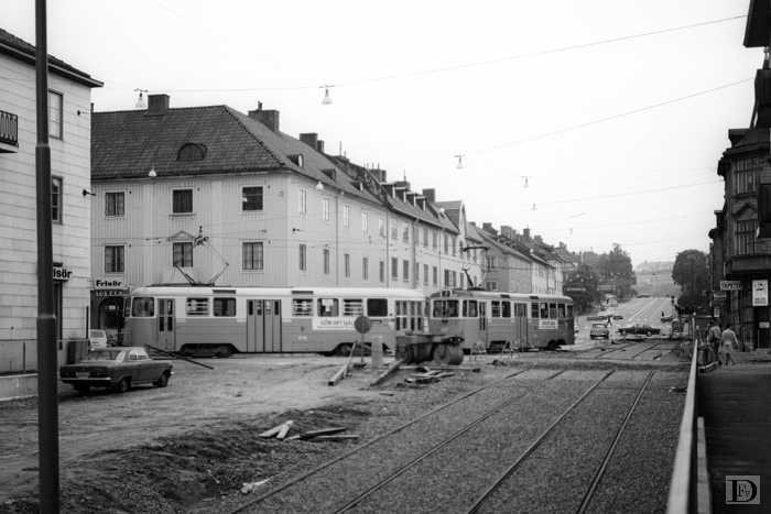 Nieuwe trambaan op de Ånäsvägen; de tram rijdt nog de oude route via Storkgatan (daar komt de tram zojuist uit) en Stockholmsgatan.
