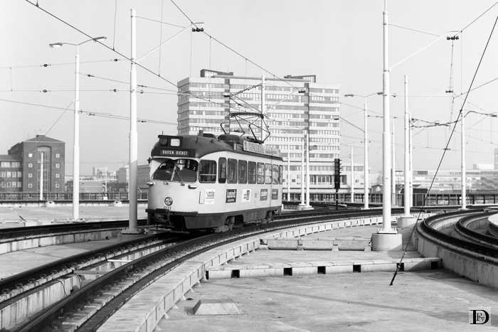 Tramviaduct tussen Ternoot en CS; PCC-car 1303 rijdt het dak van de parkeergarage Den Haag CS op.