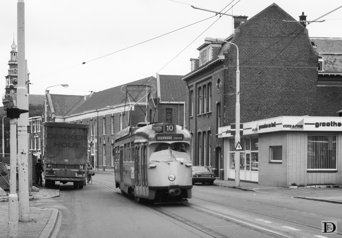 Uitrukkende lijn 10 in de Duinstraat (uitrukken van remise Scheveningen naar het Statenkwartier) . PCC-car 1147.