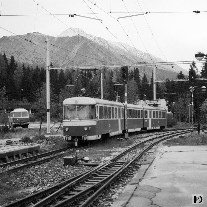 Štrbské Pleso, tram komt binnen van Poprad Tatry. Op de achtergrond de Vysoké Tatry.