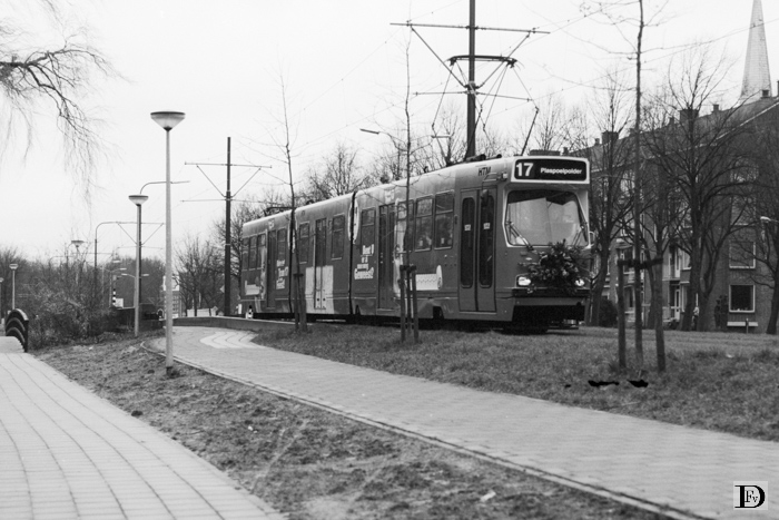 De 3045 met een mooi bloemstuk omdat het de eerste dienstwagen op lijn 17 was, die overigens zonder feestelijkheden was gaan rijden. Het rijtuig is in een speciale beschildering ter gelegenheid van de nieuwe tramlijn.