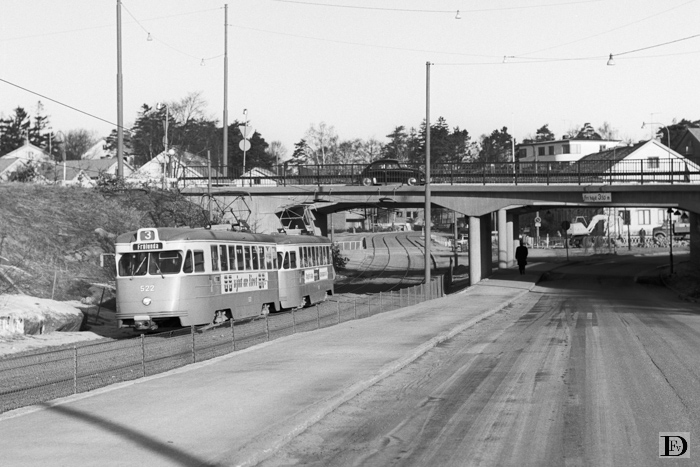 Frölundaborg met een lijn 5 richting Frölunda. Marklandsgatan bij Kungsladugårdsgatan met viaduct Dukatsgatan.