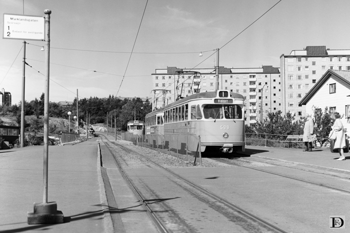 Frölundaborg met lijn 1 uit richting Högsbotorp en lijn 3, die naar zijn eindpunt Frölundaborg toe rijdt.