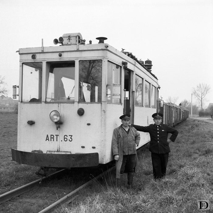 Meeffe driehoek. "Machinist" en "geleider" poseren voor de tracteur! ART 63 met acht goederenwagens met suikerbieten. Tram Champion (Namen) - Forville - Embrésin (op de lijn naar Hannut). Zaterdag 22 november 1958.