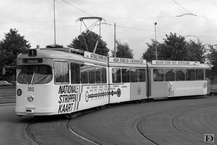 „Strippenkaarttram" 302 ruim twee weken na zijn indienststelling aan het beginpunt Honingerdijk van lijn 1.