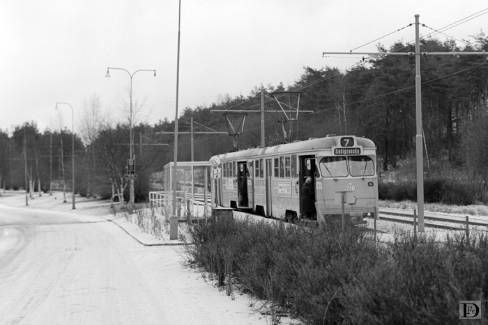 Halte Beväringsgatan met lijn 7 richting centrum en Sahlgrenska (voorste rijtuig) respectievelijk Guldheden (achterste rijtuig).