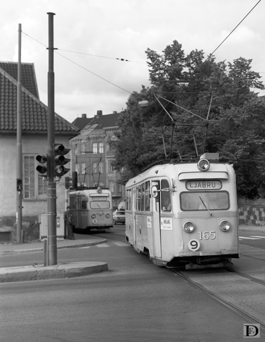Motorrijtuig 165 op lijn 9 naar Ljabru. Daar achter de 194 als extra ("lijn" X) tot BrÄten. Tot voor kort was dit de Ekebergsbanen met z'n zware treinstellen.