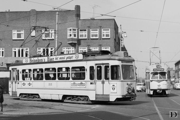 Overgangstijd op lijn 3 en 12 ! Emr.212 van lijn 3 draait op het Goudenregenplein de route van lijn 12 af, op weg naar de Kwartellaan; lijn 12 komt vanaf het Markenseplein door de Goudenregenstraat aanrijden, PCC-car 1203.