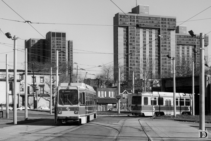 Links lijn 13, 9110, die de subway uit komt, rechts op de achtergrond rijdt 9017 de subway in.