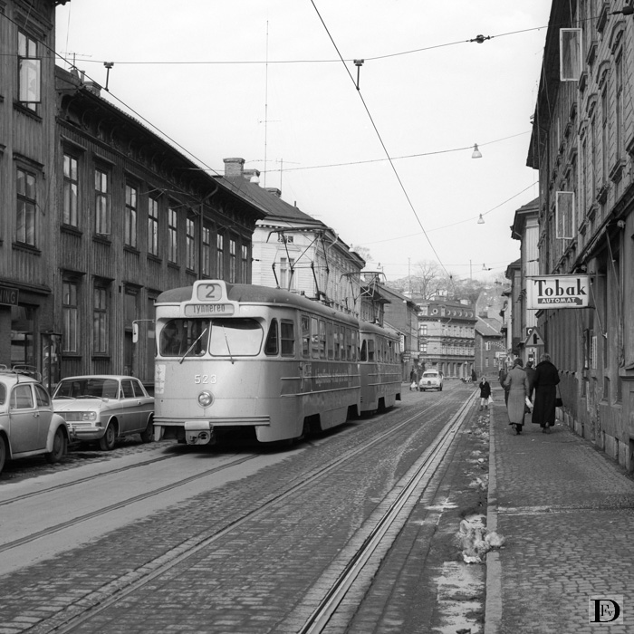 Lijn 2 rijdt hier door een oude stadswijk met grote houten huizen.