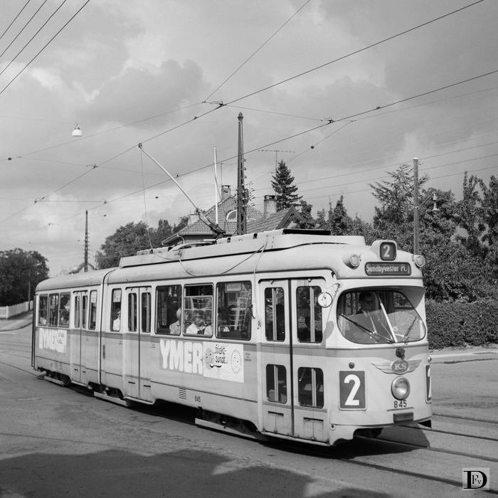 Düwag motorrijtuig 845 op lijn 2 in de Annebergvej, kort na vertrek van het oostelijke eindpunt Brønshøj.