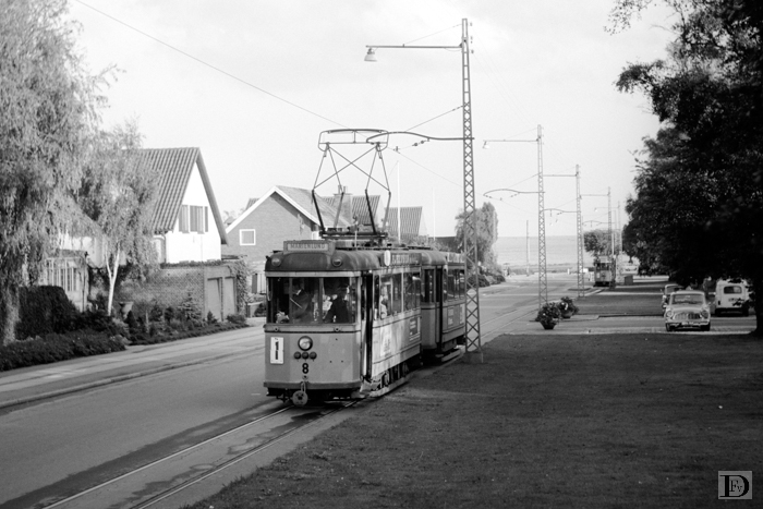 Dalgas Avenue met lijn 1, 8 + 46, kort na vertrek van het beginpunt. Op de achtergrond het beginpunt met een andere lijn 1, daar achter het Kattegat.