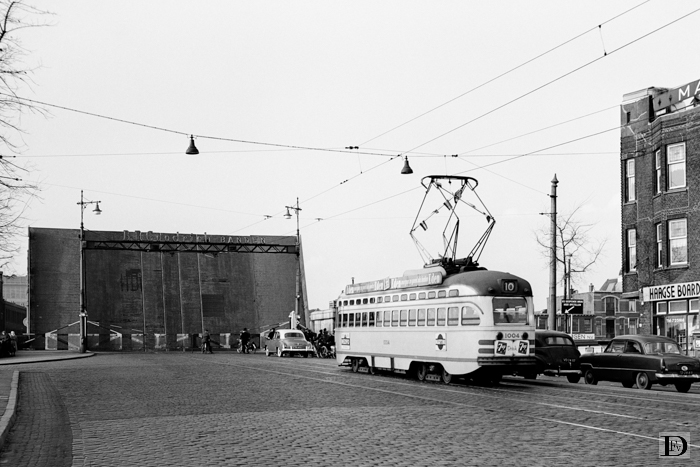 Lijn 10, PCC 1004, staat voor de open Laakbrug te wachten, een veel voorkomend verschijnsel ...