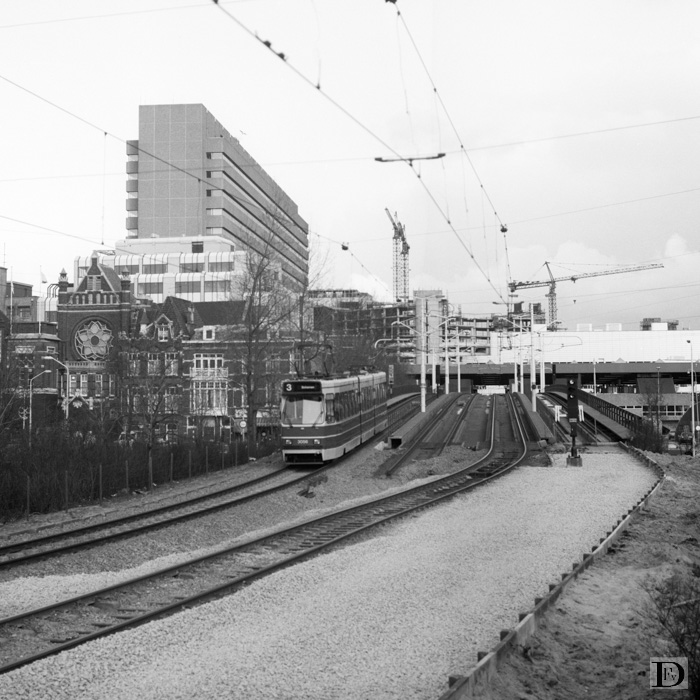 Lijn 3 op de afrit van het viaduct tussen C.S. en de Kalvermarkt. De foto is genomen tijdens de ombouw i.v.m. de aanleg van de trambaan voor lijn 1 en lijn 9 door het Forum gebied.