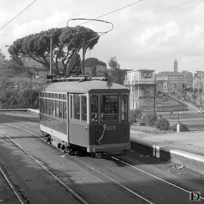 Uitzicht van de Viale del Parco op van links naar rechts emr. 1015 (een twee-asser) op lijn 15, de Arco di Costantino, het Foro Romano en het Colosseo.